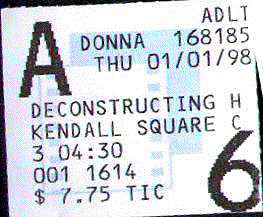 The line moved slowly, ever so slowly. I regretted having left my gloves and scarf in the car. I zipped my Land's End Squall Jacket all the way up and burrowed my head into it so my ears were covered - don't want frostbitten ears - and jammed my hands into my pockets. There are still a few seats left for Deconstructing Harry. Shall we see it? Woody Allen is a national treasure as a filmmaker but as a human being...? What's this with marrying Soon Yi? A case of bad boundaries as the social workers put it. Nancy and I discuss/debate the issues involved. Finally we are at the ticket window. Shall we go for it? Yes. That said, it was unexpectedly very funny. Alternating between scenes from Harry's novels and scenes from Harry's own life, we get to see how he uses everybody around him as material. Harry's not a likable guy. He's self-absorbed, devoid of empathy, a womanizer, an all-around jerk. His real life unravels around him as he's on his way to a day honoring him at his old college. It gets harder to distinguish truth from fiction as the movie goes on, especially since his supposed real life is even weirder than the fictions he weaves from it. I wasn't sure whether I would like this movie, nor whether I should like it. But I did. I was still laughing as I walked back to my car. | ||